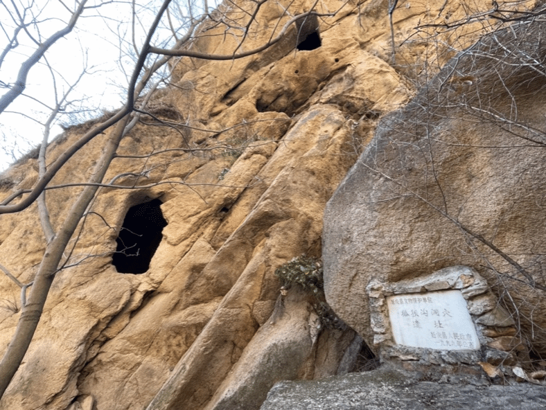 前行约2公里的山间小道后,到了海拔1200余米的顶峰,崖居遗址遥遥可望,南下沟掌,可见西侧“迎客松”下崖壁上的几处石室遗存。